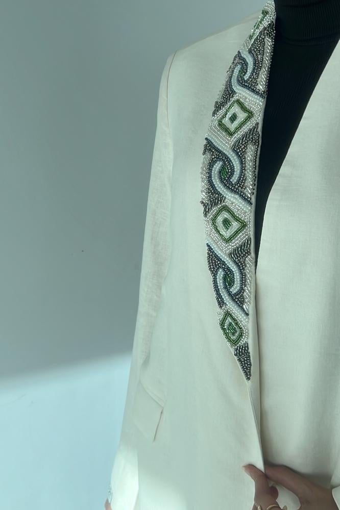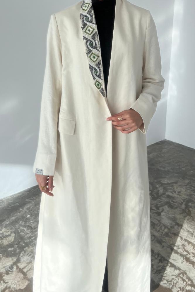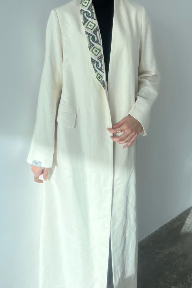 بليزر عباية أنيقة بقصة عصرية بقماش اللنن المستورد باللون البيج مبطنة بقماش البونجه مع خياطة داخلية وجيوب امامية و فتحة من الخلف و كتافات اسفنج