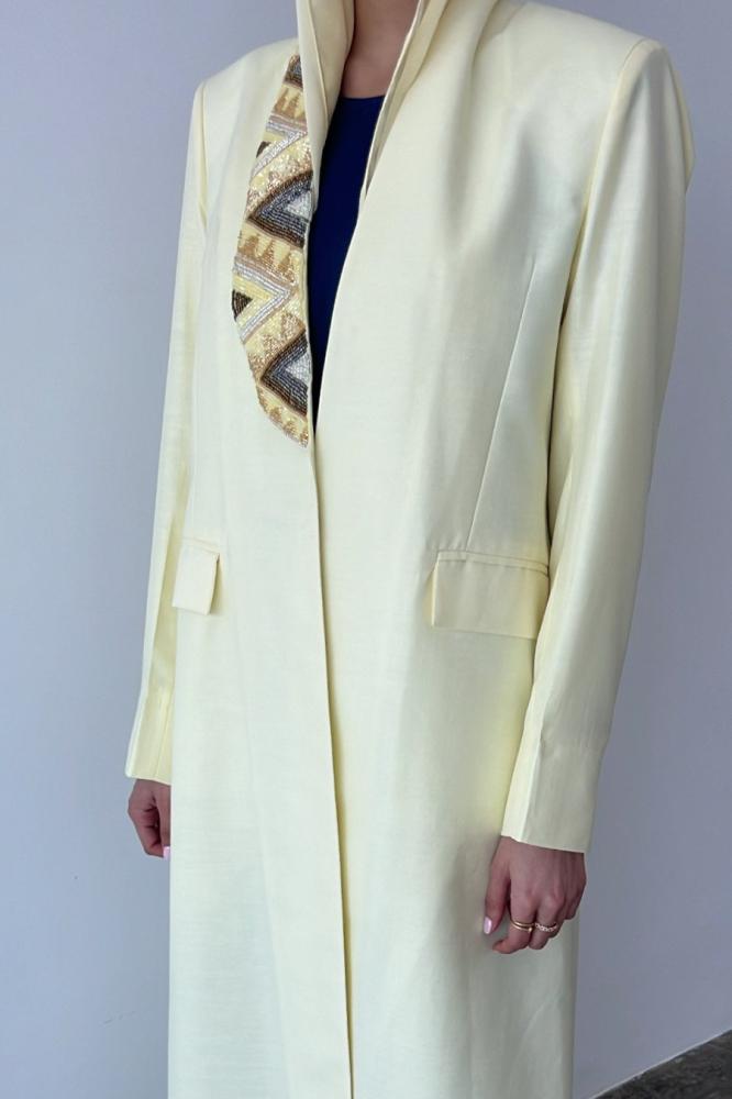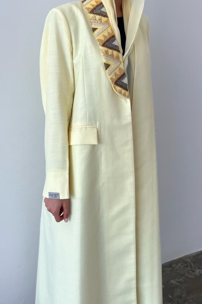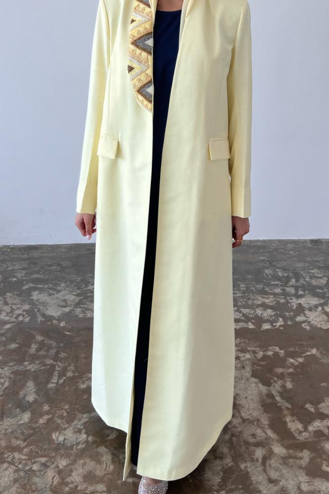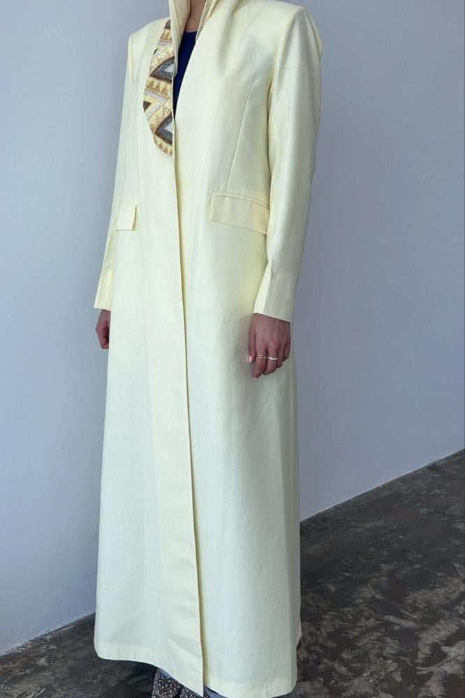 بليزر عباية أنيقة بقصة عصرية بقماش اللنن المستورد باللون الاصفر الفاتح مبطنة بقماش البونجه مع خياطة داخلية وجيوب امامية و فتحة من الخلف و كتافات اسفنج