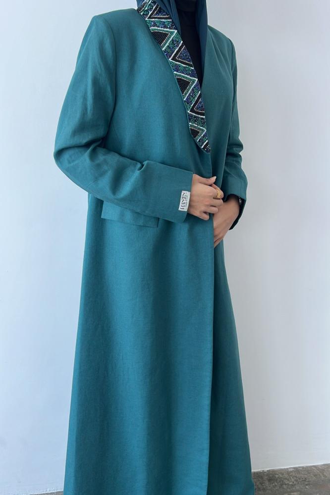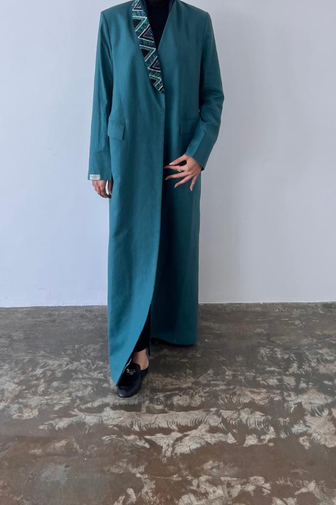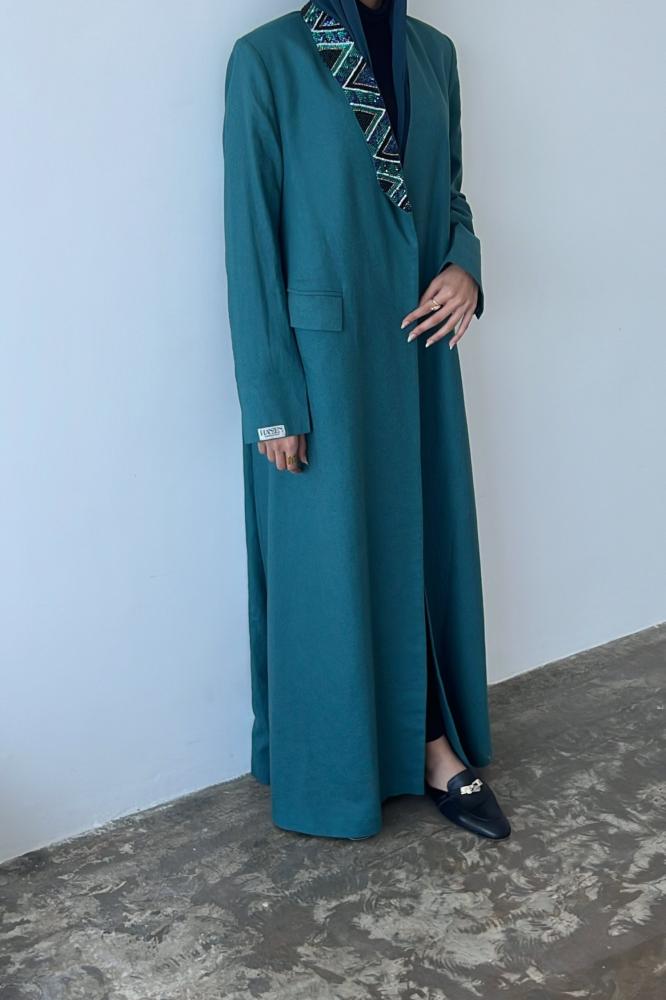 بليزر عباية أنيقة بقصة عصرية بقماش اللون باللون التركواز مبطنة بقماش البونجه مع خياطة داخلية وجيوب امامية و فتحة من الخلف و كتافات اسفنج