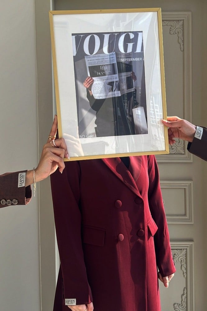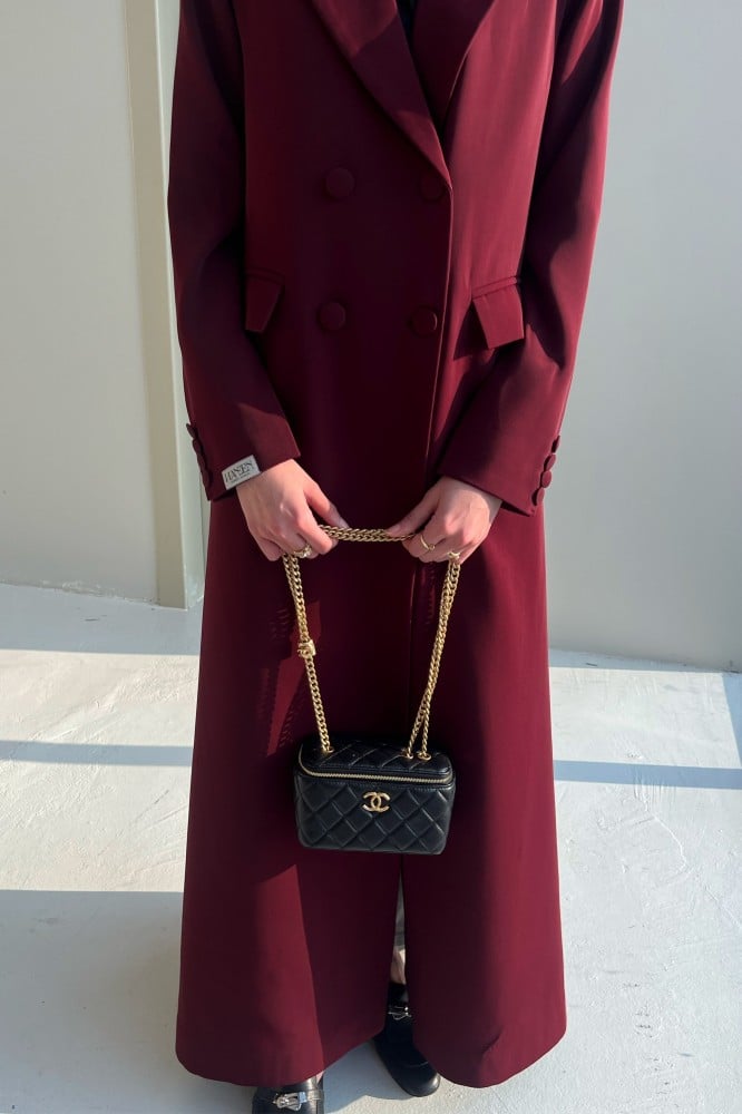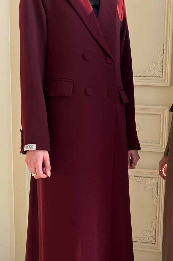 بليزر عباية أنيقة بقصة عصرية بقماش الكريب الأندنوسي باللون العنابي مبطنة بقماش البونجه مع خياطة داخلية وجيوب امامية و فتحة من الخلف و كتافات اسفنج