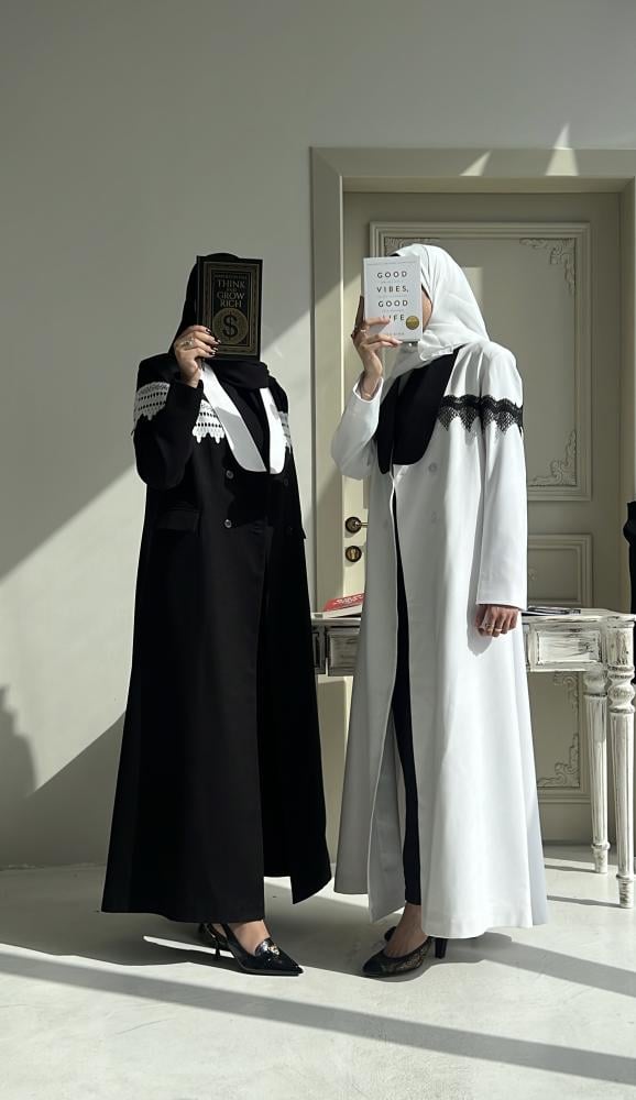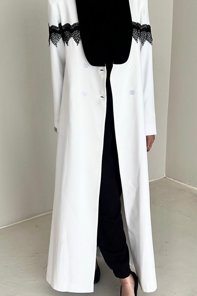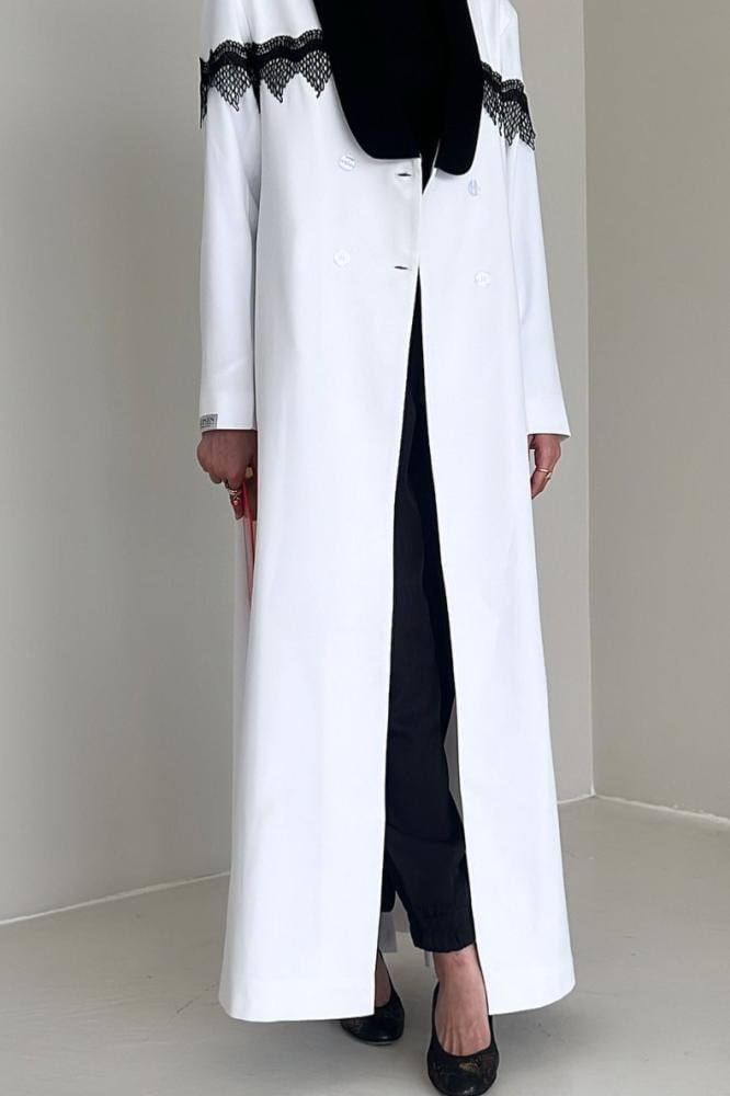 بليزر عباية أنيقة بقصة عصرية بقماش الليمار المستورد باللون الأبيض مبطنة بقماش البونجه مع خياطة داخلية وجيوب امامية و فتحة من الخلف و كتافات اسفنج مع إضافة كلفة باللون الاسود وياقة سوداء
