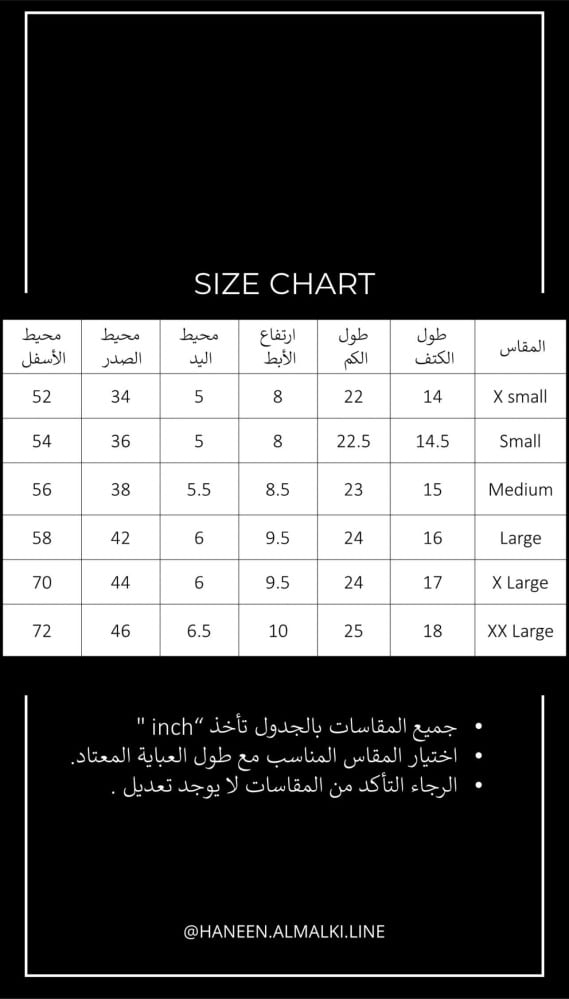 المقاس Size - جدول المقاسات مرفق مع صور القطعة