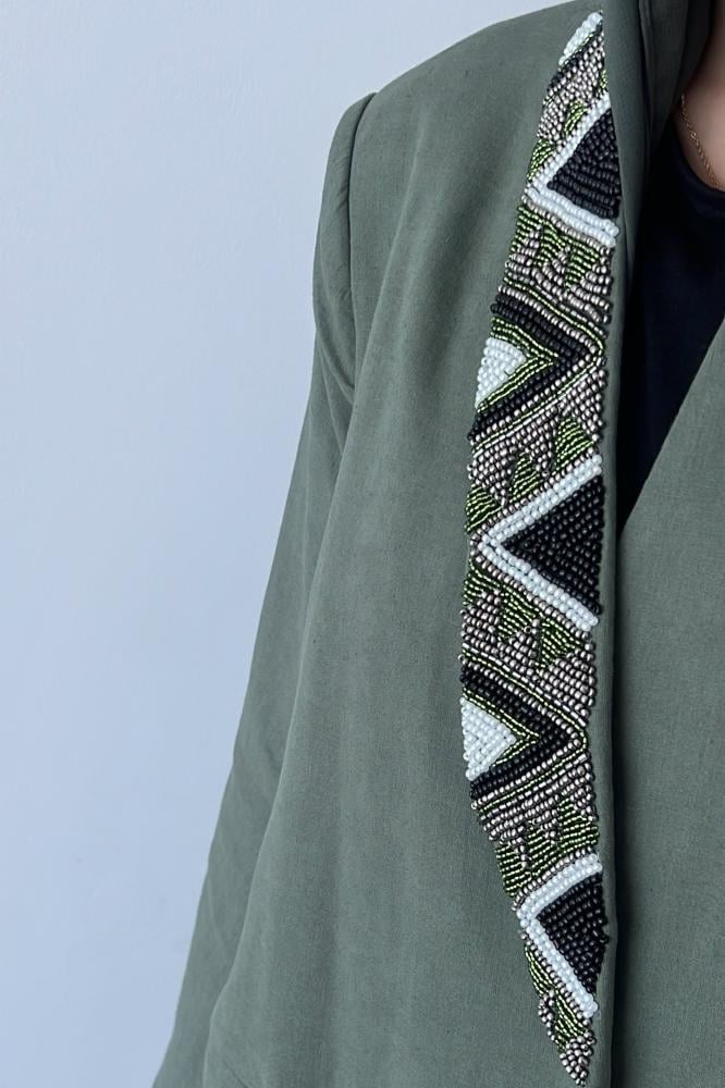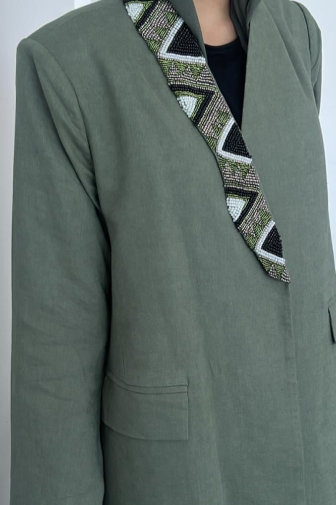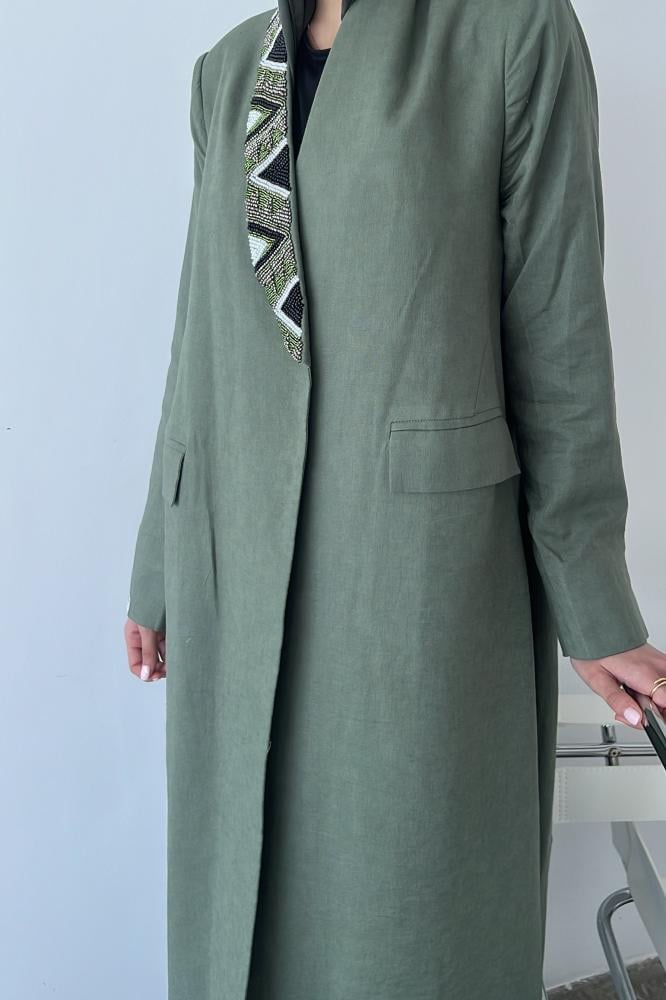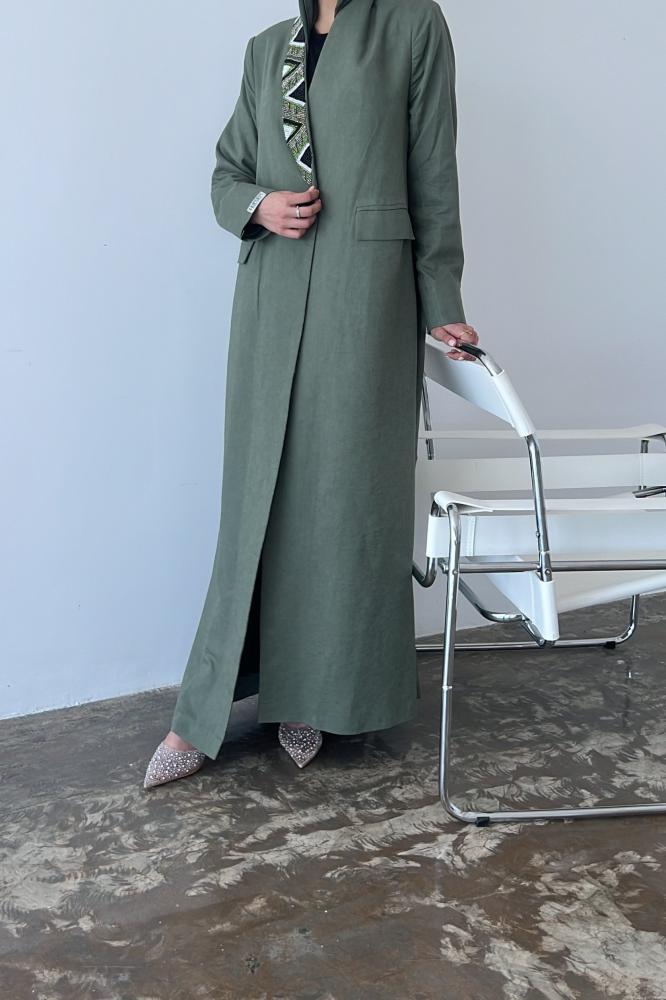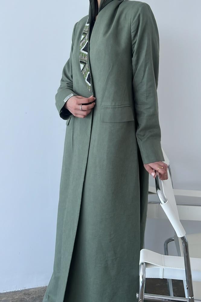 بليزر عباية أنيقة بقصة عصرية بقماش اللنن المستورد باللون الاخضر الفاتح مبطنة بقماش البونجه مع خياطة داخلية وجيوب امامية و فتحة من الخلف و كتافات اسفنج