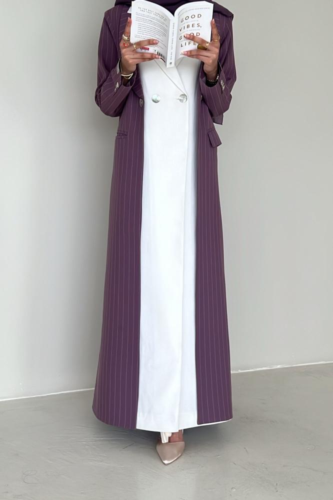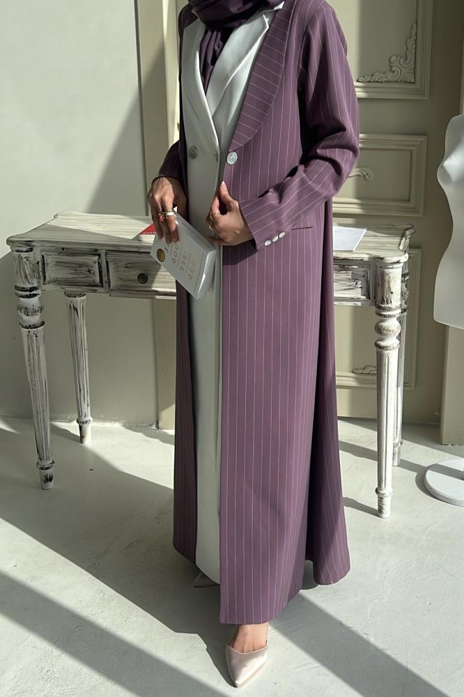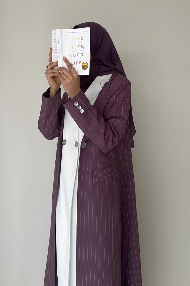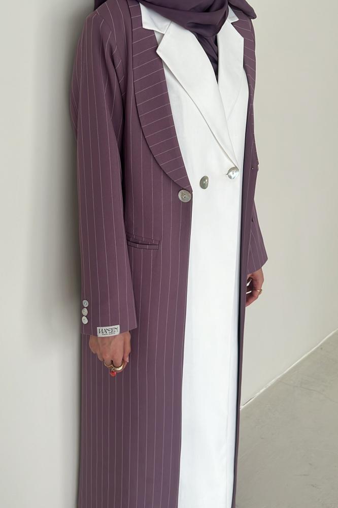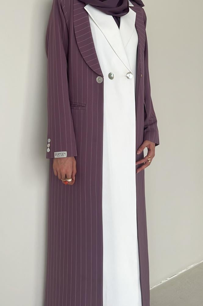 دبل بليزر عباية أنيقة بقصة عصرية بقماش الكتان الكوري باللون البنفسجي مبطنة بقماش البونجه مع خياطة داخلية وجيوب امامية و فتحة من الخلف و كتافات اسفنج مع ازارير صدف