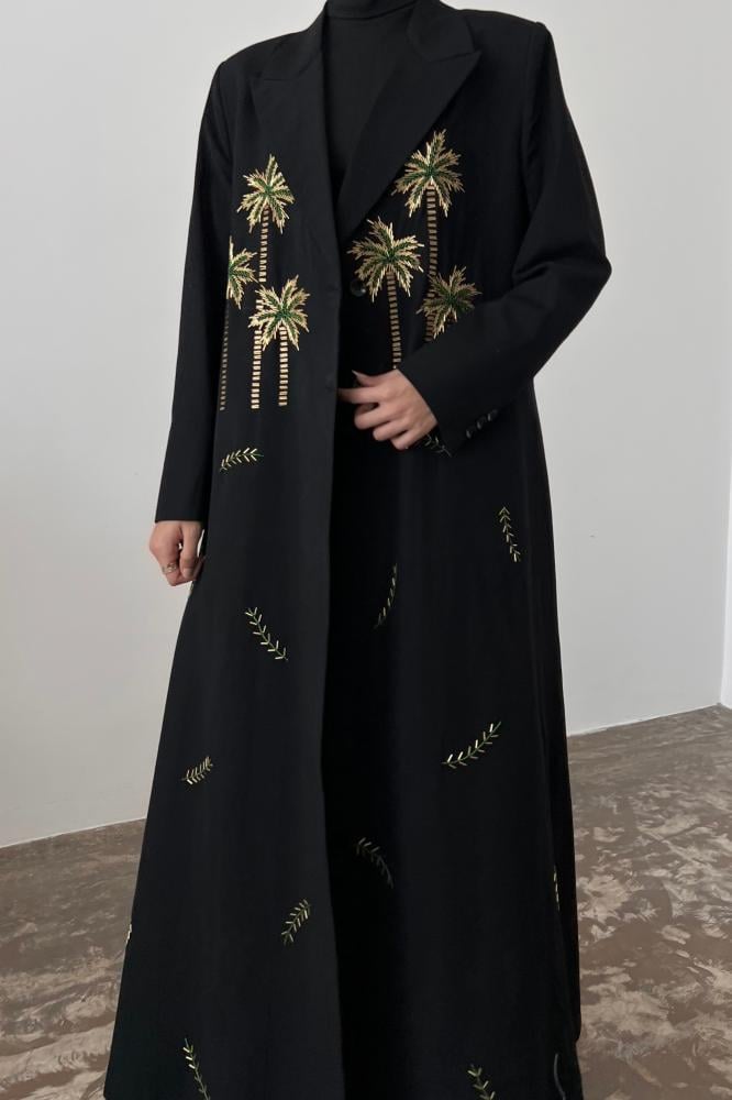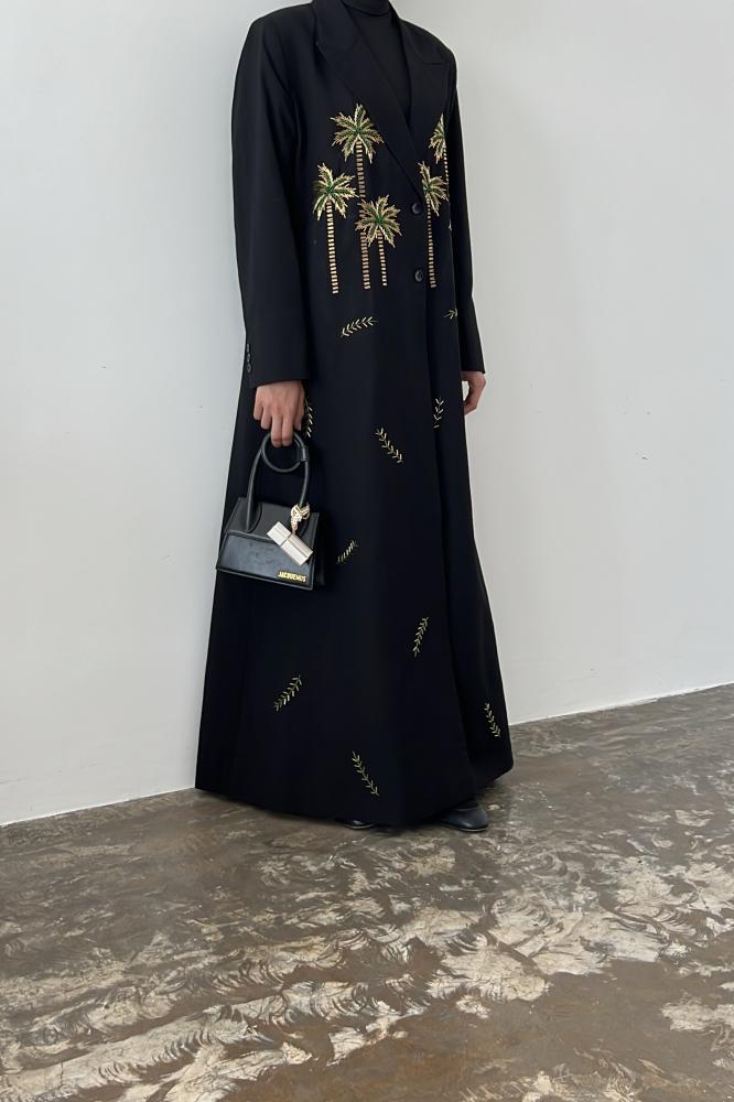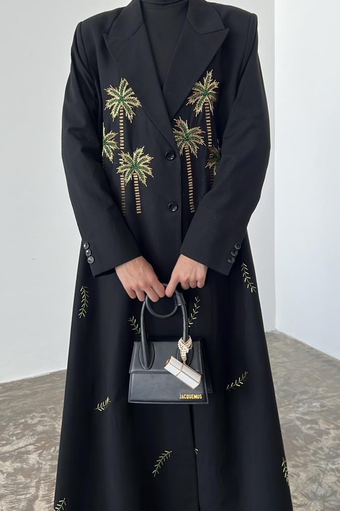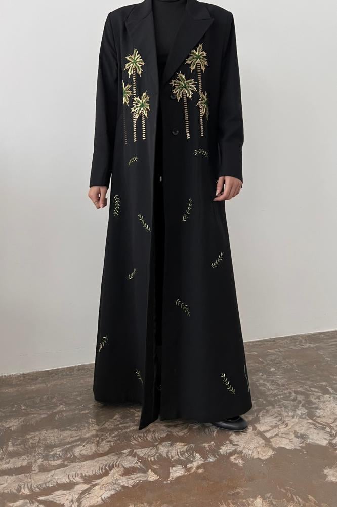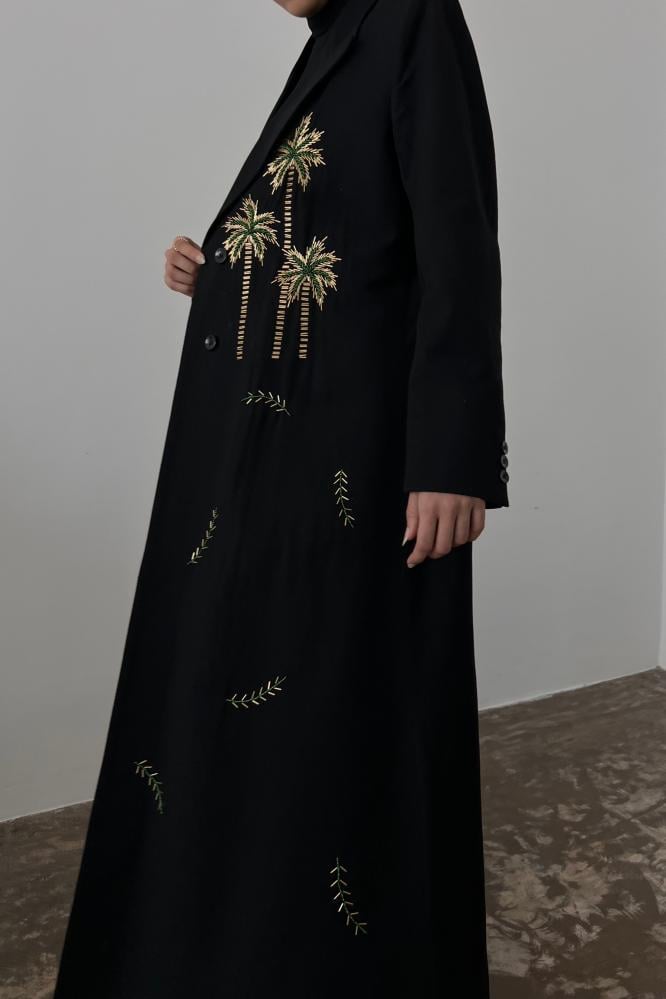 بليزر عباية أنيقة بقصة عصرية وتصميم خاص لليوم الوطني السعودي 95 بقماش اللنن باللون الاسود مبطنة بقماش البونجه مع خياطة داخلية وجيوب امامية و فتحة من الخلف و كتافات اسفن و شك يدوي